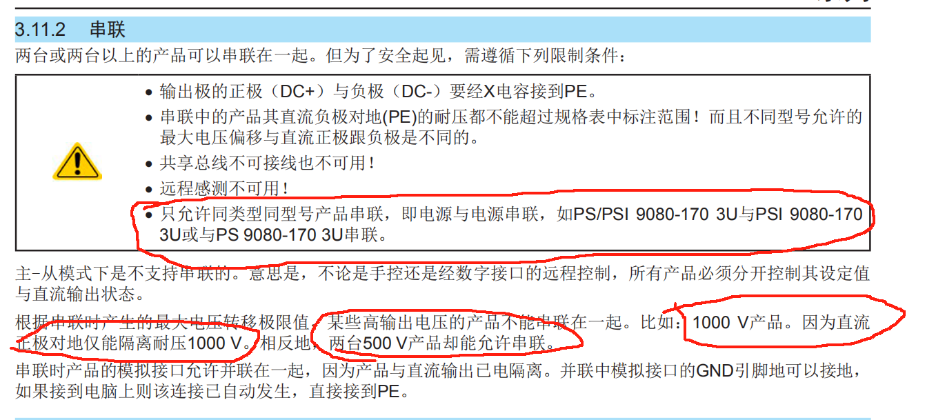 近日,我公司的合作好伙伴合肥天時測控技術有限公司的徐經理咨詢一個德國EA直流電源能否串聯的問題。客戶提出,以PSI 9500-60 3U的電源為例,能否串聯以便獲得大于500V的輸出電壓?